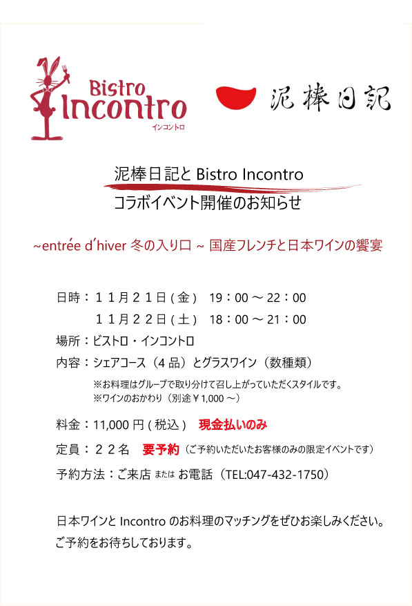 泥棒日記とBistro Incontro コラボイベント開催のお知らせ