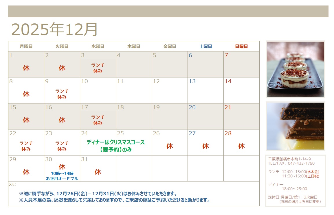 12月1日㈪-2日㈫、8日㈫、15日㈪-16日㈬、26日㈮-31日㈬
