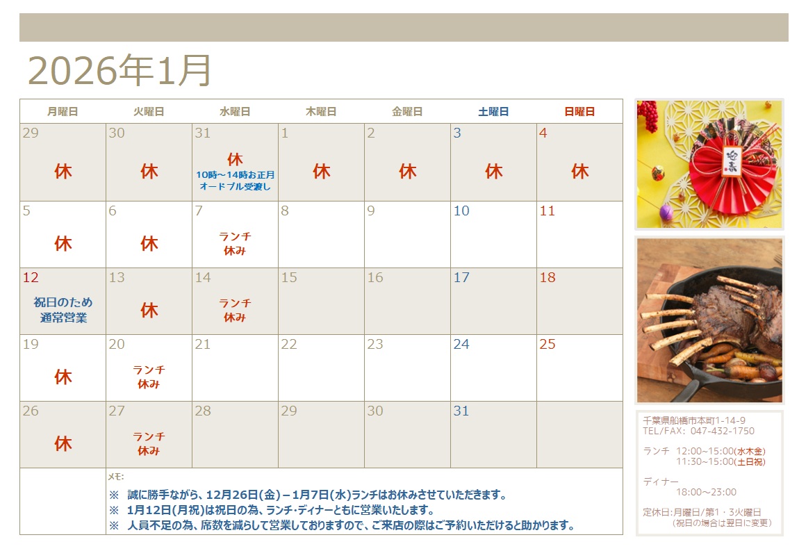 【1月の定休日】